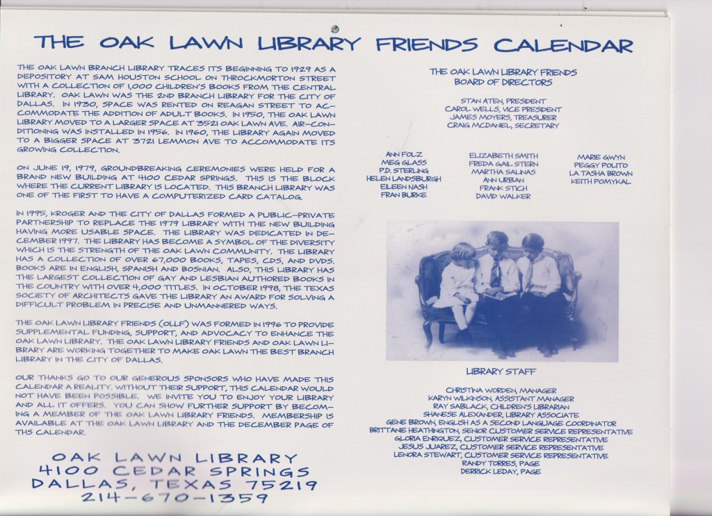 About us: The Oak Lawn Library Friends (OLLF) was formed in 1995 to help provide supplemental funding in support of the Oak Lawn Library, a branch of the Dallas Public Library. We work closely with library staff to support the extras (programs, art shows and other amenities that make our branch special).