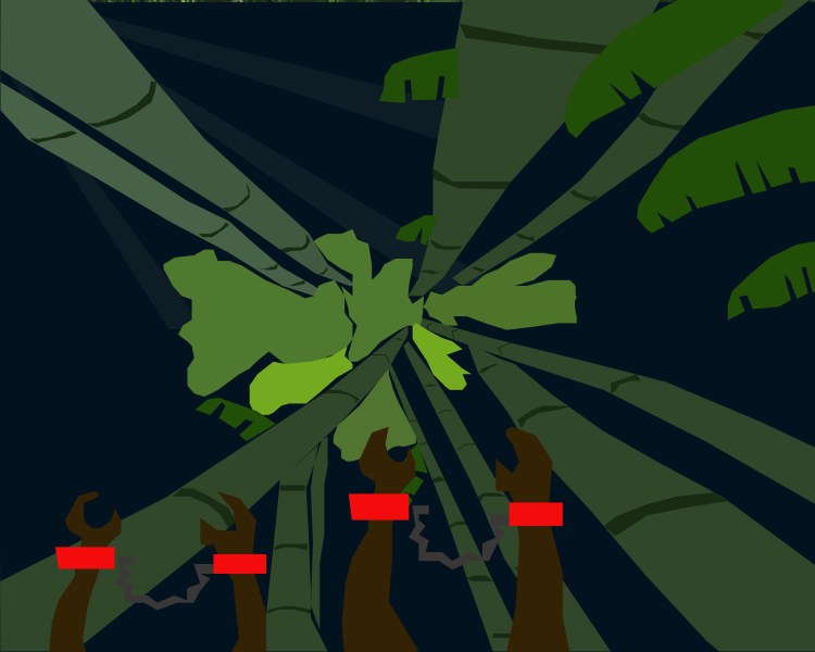 This wink to artist Aaron Douglass style of creating images that tell African American stories. It pays tribute to those who were captured in slavery during the diaspora. These people looked up in the moment because forward was too hard.