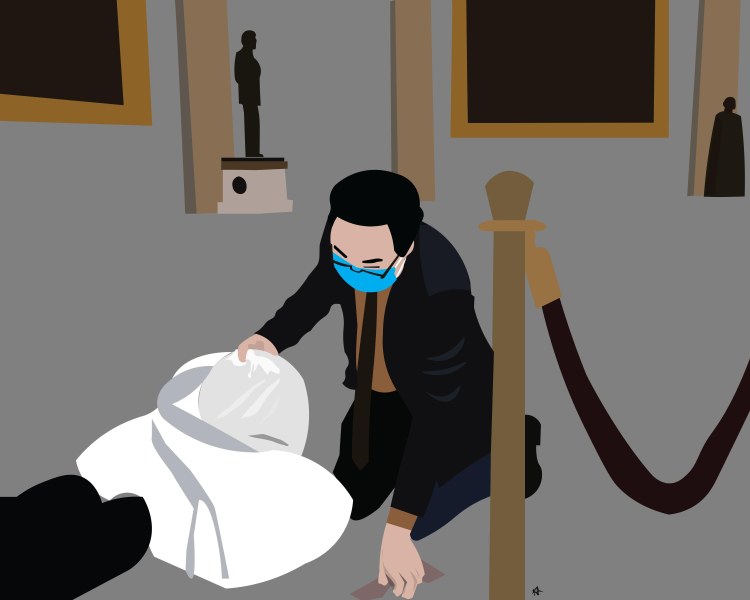 This work comes from an image of Representative Andy Kim, D-New Jersey, cleaning the capitol after the insurrection on Jan 6. While everyone was posturing, he led with action.