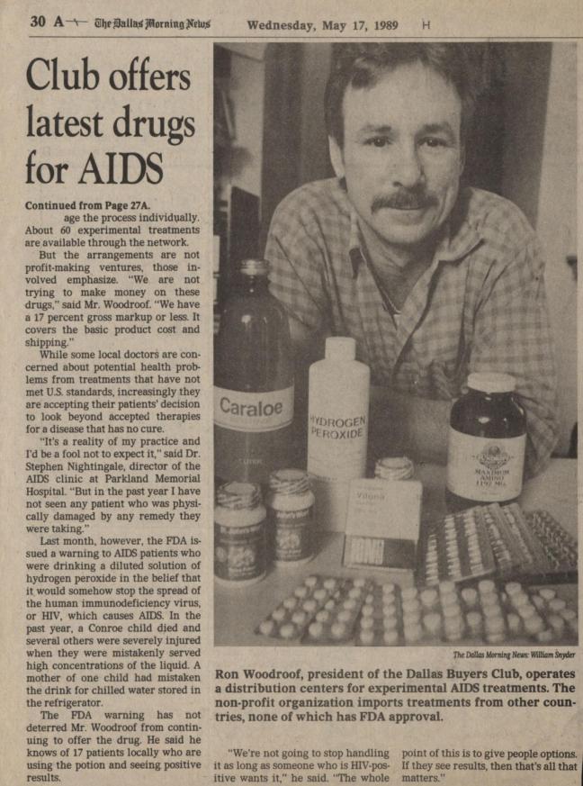 Dallas Buyer’s Club was created by Dallas native Ronald Woodroof, in 1988. After being diagnosed with HIV and rejected from drug trials, Woodroof researched treatments that were being used in other countries and began smuggling unapproved drugs into the U.S. for HIV/AIDS patients to use. Though many of these treatments had little effect against the disease, the Dallas Buyer’s Club offered hope at an affordable price. After Woodroof’s death in 1992, Dallas Buyer’s Club continued under new management and a new name, DBC Alternatives.