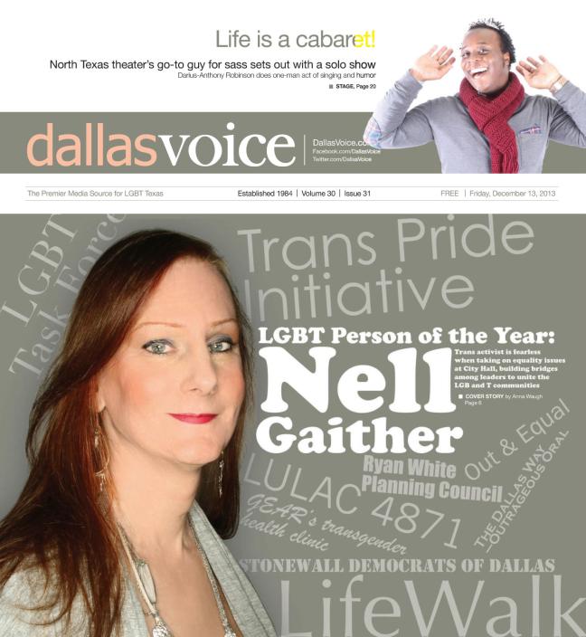 Nell Gaither founded the Trans Pride Initiative, in 2011, with the focus on bringing the transgender community together, and offering healthcare information to community members who are often discriminated against by their doctors and healthcare professionals. With this focus on healthcare, Gaither began to look at the health coverage offered to City of Dallas employees, and realized that trans medical care was not adequately covered. She worked with the city’s LGBT Task Force to fight for better and broader health coverage for trans employees. While continuing to fight for trans rights and health services locally and nationally, Gaither has also focused on other needs of low income trans people, such as homelessness, for which she founded the Dallas Trans Shared Housing Project, in 2014.