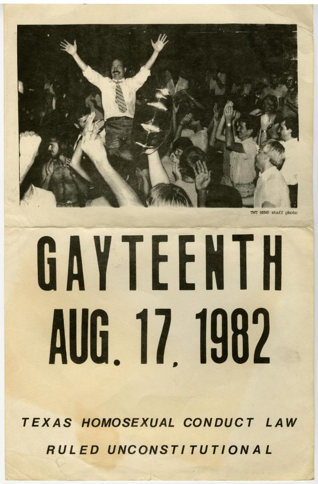 Don Baker, president of the Dallas Gay Alliance (1980-82), was fired from his teaching position at the Dallas Independent School District after coming out as gay on a television interview, in 1977. His termination was based on Texas’ Penal Code §21.06, created in 1974, which criminalized sexual acts between same sex individuals. In 1979, Baker filed a suit, in federal district court in Dallas, to have the law ruled as unconstitutional. The event was sponsored by the first state-wide LGBTQ organization, Texas Human Rights Foundation. The law suit, Baker v. Wade, was won in 1982 in the court of federal Judge Jerry Buchmeyer, but an appeal was filed and the federal circuit court reversed the ruling, in 1986, upholding the anti-sodomy law.