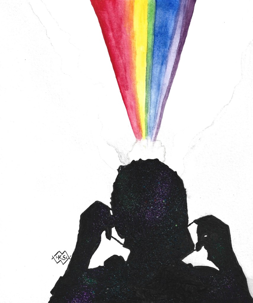 “The mask I once wore to shy away from the uncomfortable and unwanted in my own life has been transformed through acceptance. Leaning into the uncomfortable and messy, the Source within has transformed trauma and shame to expose beauty through artwork. I’m driven by an inner fire that is unquenchable. This is fueled by my inner child recovering from trauma and speaking for the voiceless. She is the flame that drives me to create, explore, and do the unexpected. She is a goddess empowering my every step throughout the process of discovering myself as an artist. “