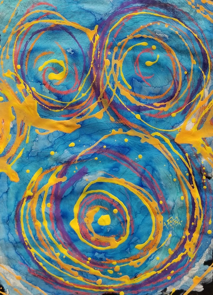 Layers of color began with blue alcohol inks made from dried out felt tip markers. As the flow of life came to the surface, a swirling energy was revealed and the source of love came into focus.