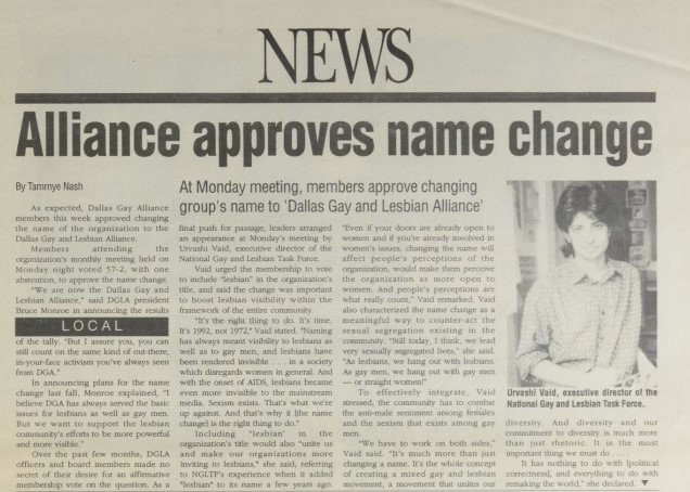 It was not until 1993 that the Dallas Gay Alliance voted to officially add “lesbian” to their name. Following local pressure and amidst a nationwide trend to include “lesbian” in similar organization names, the Dallas Gay Alliance took great care to educate members about the importance of this change before another vote on the topic. When the votes were cast, the decision was unanimous, and the organization was thereafter known as the Dallas Gay and Lesbian Alliance.