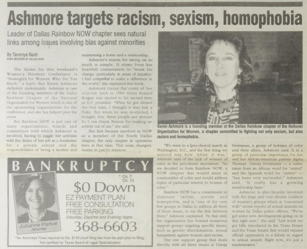 Karen Ashmore founded the Dallas Rainbow Chapter of the National Organization for Women (NOW), in 1990. The Dallas Chapter of NOW was already in existence when Ashmore realized how few women of color were participating, and she wanted to include women of color in larger conversations to address issues that they faced. With this in mind, she petitioned to have the existing chapter take on the Rainbow title with the goals of eliminating racism, sexism, and homophobia. With its creation, this group led to even more lesbian organizations being created that focused on race and ethnicity, like Umoja Hermanas.