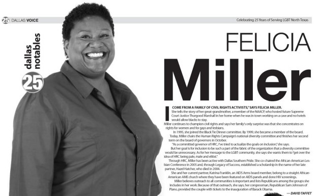 Felicia Miller has worked with local and national LGBTQ organizations, with a goal of protecting gay and lesbian civil rights. As a committee chair for the national Human Rights Campaign, Miller used her position to make the organization more inclusive by helping people understand that HRC is not “pale, male, and elitist.” Working with the Legacy of Success, Miller established a scholarship in the name of her late partner, Hazel Hatcher, and served as co-chair of the African American Lesbian Conference in 2005. Together with her current partner, Katrina Franklin, Miller also works with AIDS Arms Inc. to host traditional events such as Soul Food Sunday for the African American community.