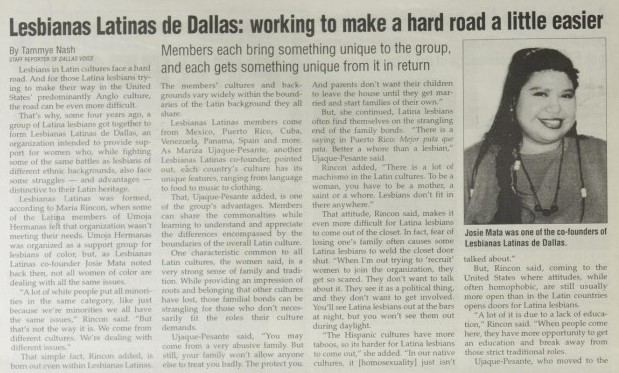 Umoja Hermanas (Sisters United), was founded in 1992 by Josie Mata. This organization for lesbian women of color in Dallas, created a safe space for members to gather and discuss social issues, such as race, gender, and sexual orientation. Soon after they organized, there was a call to include bisexual women in the group as well. After discussing the issue at a meeting, the group agreed to include bisexual women. Umoja Hermanas worked with other groups in the LGBTQ community to promote the acceptance of LGBTQ people of color both in their racial communities and in the broader LGBTQ community, until the group disbanded in 1998.