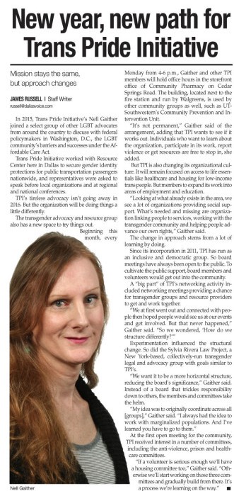 Nell Gaither founded the Trans Pride Initiative, in 2011, with the focus on bringing the transgender community together, and offering healthcare information to community members who are often discriminated against by their doctors and healthcare professionals. With this focus on healthcare, Gaither began to look at the health coverage offered to City of Dallas employees and realized that trans medical care was not adequately covered. She worked with the city’s LGBT Task Force to fight for better and broader health coverage for trans employees. While continuing to fight for trans rights and health services locally and nationally, Gaither has also focused on other needs of low income trans people, such as homelessness, for which she founded the Dallas Trans Shared Housing Project, in 2014.